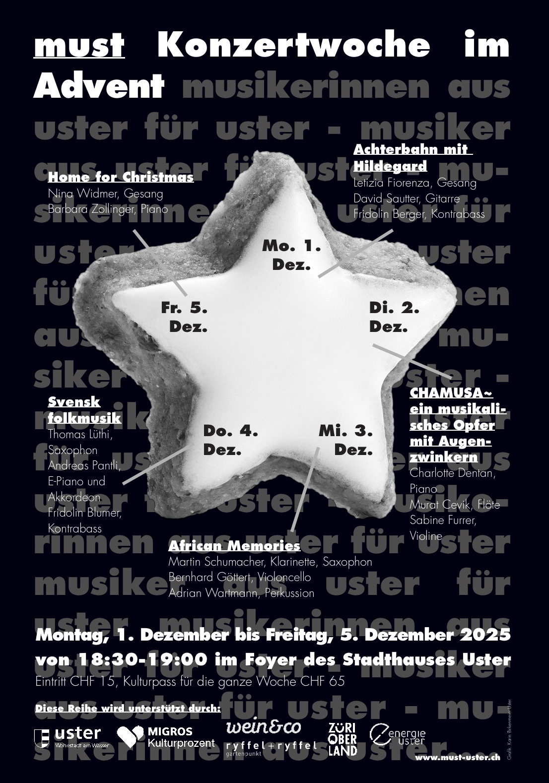 Als Ergänzung zu den sommerlichen Frühaufsteherkonzerten in der Stadtbibliothek Uster organisiert die Musikerkooperative must auch dieses Jahr wieder eine Konzertwoche im Advent und bespielt eine Woche lang das Foyer des Stadthauses Uster. Musiker_innen aus allen Sparten stellen ein wunderbares Programm aus den verschiedensten Stilrichtungen zusammen und bieten dem geschätzten Ustermer Publikum überraschende und einmalige Hörerlebnisse zum Auftakt in den vorweihnachtlichen Feierabend.